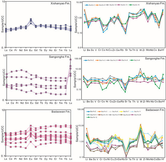 UCC-normalized trace elements and REEs of samples from the Su’asugou section in Yili Basin, NW China. UCC-normalization values are from Taylor and McLennan (1985) [55].
