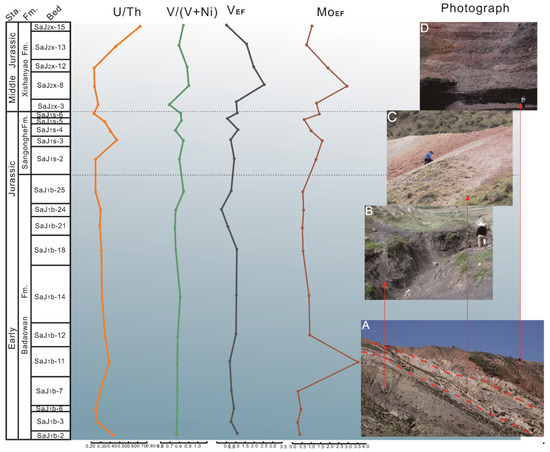 Redox-sensitive proxies (trace element ratios) and interpreted redox conditions from the Su’asugou section, Yili Basin. Photos to right of the geochemical stratigraphy are: (A) Overview of the Su’asugou section; (B) Black coal deposit in the Badaowan Fm.; (C) Red siltstone and greyish white sandstone in the Sangonghe Fm.; (D) Red burnt rocks in the Xishanyao Fm. Abbreviations: Sta.= Stage; Fm.= Formation.