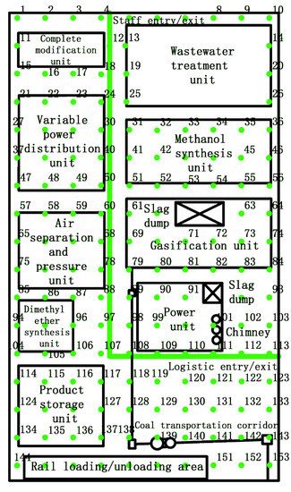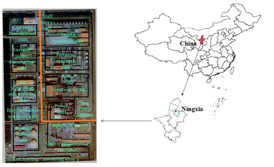 The plant area occupies 400,000 square meters. It mainly consists of the following areas: a complete modification unit, a variable power distribution unit, an air separation and pressure unit, a water treatment unit, a methanol synthesis unit, a dimethyl ether synthesis unit, a gasification unit, a power unit, a product storage unit, a coal entry corridor, a railway loading/unloading area, two slag dumps, a chimney, a road for staff entry and exit, a road for logistics entry and exit, and main roads in the factory area. The geographical location of the study area and the regional distribution of the plant are shown in Figure 1.