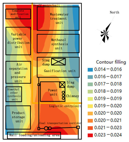 The Kriging interpolation method was used to simulate the multipath total hazard quotient of soil Cd in Table 8, and the hazard quotient evaluation map of the entire plant area was obtained (Figure 4). It can be seen from Table 8 and Figure 4 that the Cd multipath hazard quotients in the soil area of the chemical units were 0.014–0.024 (with an average of 0.020), all of which were within the acceptable level of 1. The main polluted areas were those near the coal transportation corridor, power unit, complete modification unit, and the entry/exit for people.