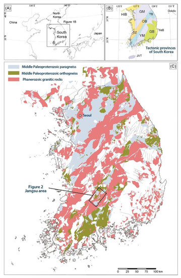 South Korea is located at the margin of the East Asian continent (Figure 1A). The tectonic provinces of South Korea largely consist of Precambrian (mainly Middle Paleoproterozoic) basement rocks, such as those of the Gyeonggi and Yeongnam massifs. The Precambrian basement rocks are separated by two narrow supracrustal units (the Hongseong–Imjingang and Okcheon belts). These provinces also include the Cretaceous Gyeongsang basin, Cenozoic Yeonil basin, and Jeju volcanic terrain, which formed after East Asian continent–continent collision during the Mesozoic (Figure 1B).