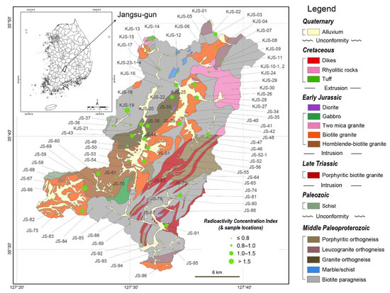 All minerals and raw materials in the rocks present on Earth commonly contain natural radioactive elements with radionuclides, but natural radioactivity exposures to humans are substantially lower than the normal background levels in human activity; thus, there are no concerns regarding protection from radiation [1]. However, the natural radioactivity in some rocks can also cause high radiation exposure [1,2,3,4,5,6,7]. These rocks have been referred to as naturally occurring radioactive materials (NORMs). Among the NORMs, radionuclides of the 238U and 232Th decay series, and 40K, which potentially occur in the environment, are of the greatest interest. In addition, various social problems have arisen because of long-lived radioactive elements (e.g., uranium [U], thorium [Th] and potassium [K]) and their decay products (e.g., radium [Ra] and radon [Rn]) in household goods and construction materials. In South Korea, NORMs, such as U and Rn in soil or groundwater, have been investigated by the government for more than 20 years, and their origins have been closely connected with geological factors, such as rock chemical composition, deformation characteristics, and others [2,3,4,5,6,7].