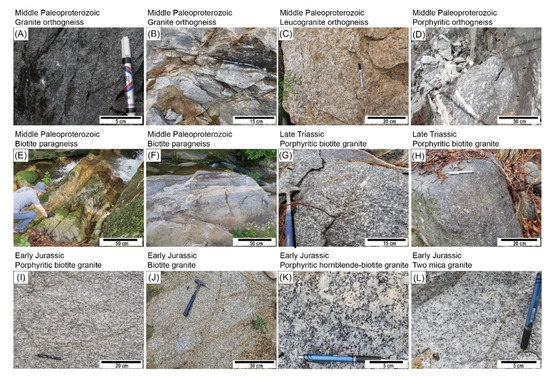 Outcrop photographs showing (A,B) Middle Paleoproterozoic granite orthogneiss with magmatic flow structure, (C) Middle Paleoproterozoic leucogranite orthogneiss, (D) Middle Paleoproterozoic K-feldspar megacryst-bearing porphyritic orthogneiss, (E,F) Middle Paleoproterozoic banded biotite paragneiss having alternation of biotite paragneiss and granite orthogneiss, (G,H) Late Triassic biotite granite with textures commonly characterized by K-feldspar megacrysts, (I,J) Early Jurassic porphyritic biotite granite, (K) hornblende-biotite granite with or without K-feldspar megacrysts, and (L) Early Jurassic two-mica granite in the Jangsu-gun area.