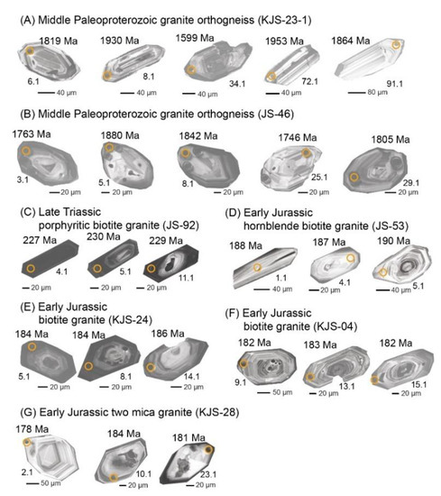 Scanning electron microscope (SEM) cathodoluminescence images of sectioned zircon grains from (A,B) Middle Paleoproterozoic granite orthogneisses, (C) Late Triassic porphyritic biotite granite, (D) Early Jurassic hornblende-biotite granite, (E,F) Early Jurassic biotite granites, and (G) Early Jurassic two mica granite in the Jangsu-gun area.