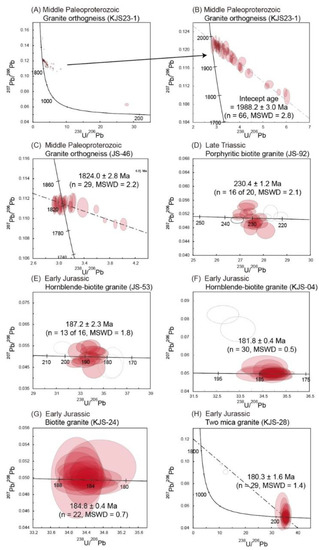From the LA-MC-ICPMS and SHRIMP U-Pb zircon ages presented in this study, there is the possibility to characterize the Middle Paleoproterozoic (ca. 1.99 Ga and ca. 1.82 Ga) magmatic events, and Late Triassic (ca. 230 Ma) and Early Jurassic (187–180 Ma) magmatic events in the Jangsu-gun area (Figure 8).
