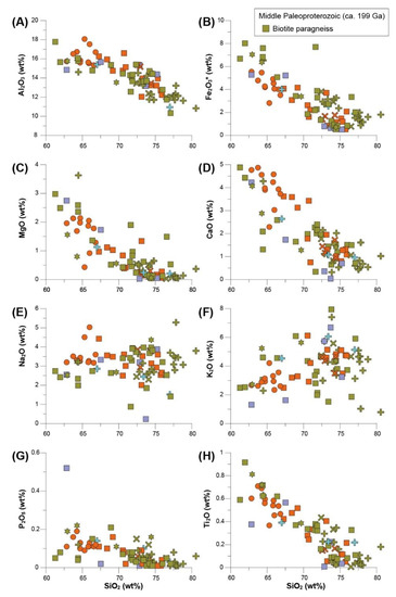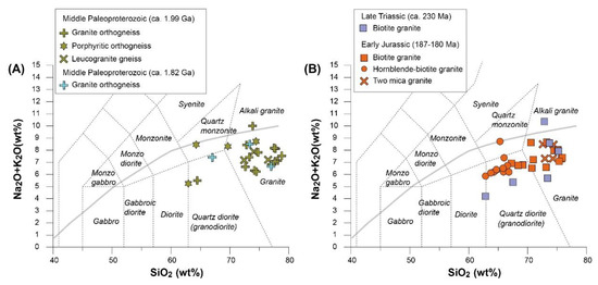 The Middle Paleoproterozoic granite orthogneisses, and Early Jurassic granitic rocks from the Jangsu-gun area were mainly analyzed to determine their geochemical signatures (Table S2). The Middle Paleoproterozoic biotite paragneisses and Late Triassic granites were also analyzed to interpret geochemical characteristics in the Jangsu-gun area. On the SiO2 versus Na2O + K2O diagram, with fields defined by [29] (Figure 6), the ca. 1.99 Ga Middle Paleoproterozoic samples mainly plotted in the diorite, quartz monzonite, quartz diorite and granite fields. The ca. 1.82 Ga Middle Paleoproterozoic orthogneiss samples are plotted in the quartz diorite and granite fields. The Late Triassic porphyritic granite and Early Jurassic biotite granite samples are also plotted in the quartz diorite and granite fields. The Early Jurassic hornblende-biotite granite samples are mainly plotted in quartz diorite, and the Early Jurassic two-mica granite samples are plotted in the granite field.