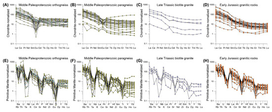 (A–D) Chondrite-normalized rare earth element (REE) patterns, and (E–H) primitive mantle-normalized trace element distribution diagrams [31] for the Middle Paleoproterozoic orthogneisses, biotite gneisses, Late Triassic granite and Early Jurassic granitic rocks in the Jangsu-gun area. Symbols are as in Figure 6 and Figure 7.