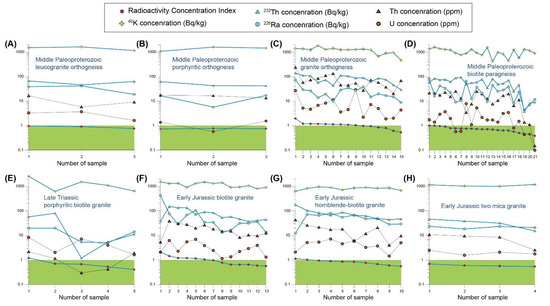 Plots of U and Th concentrations of geochemical analysis and the activity concentrations of 226Ra, 232Th, 40K and RCI values for (A–D) Middle Paleoproterozoic granite orthogneisses, (E) Late Triassic porphyritic biotite granite, (F) Early Jurassic biotite granite, (G) Early Jurassic hornblende biotite granite, and (H) Early Jurassic two mica granite in the Jangsu-gun area.