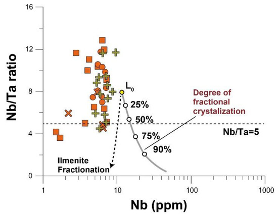 The degree of fractional crystallization in the peraluminous granitic rocks can be determined from the Nb/Ta ratio in the whole-rock chemistry (Figure 12) [34]. In general, a decrease in the Nb/Ta ratio in evolved melts suggests effects of both fractional crystallization and sub-solidus hydrothermal alteration. The extensively surveyed Middle Paleoproterozoic orthogneiss and Early Jurassic granitic rocks in the Jangsu-gun area show a degree of fractional crystallization of approximately 50%, with a maximum Nb/Ta of five. However, most of these rocks in the Jangsu-gun area do not show Nb/Ta values much lower than five, and therefore the role of sub-solidus hydrothermal alteration in their late stages of evolution is considered to be insufficient.