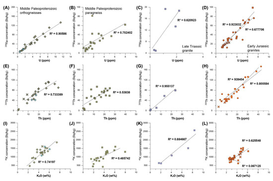 226Ra versus U, 232Th versus Th, and 40K versus KO2 diagrams for the Middle Paleoproterozoic orthogneisses (A,E,I), Middle Paleoproterozoic paragneisses (B,F,J), Late Triassic granite (C,G,K), and Early Jurassic granites (D,H,L) in the Jangsu-gun area. R2 is value using linear regression for the number of analyzed samples in each rock unit. Symbols are as in Figure 6 and Figure 7.