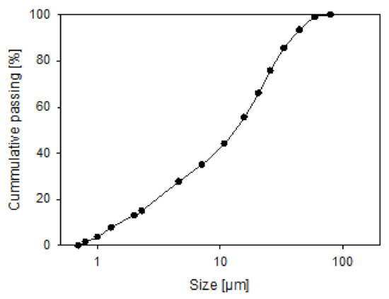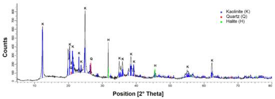 Kaolin particles were from Ward’s Science. Volume weighted particle size distribution (PSD) was obtained using a Microtrac S3500 laser diffraction analyzer (Verder Scientific, Newtown, PA, USA). Its composition was determined by XRD analysis on a Bruker, D8 Advance X-ray diffractometer (Bruker, Billerica, MA, USA) using the Powder Diffraction File of 2020 ICDD (International Center for Diffraction Data) database. The spectra show a majority (over 10%) of halite and kaolinite and a minority (1–10%) of SiO2 (Figure 1). Furthermore, the FTIR spectrum (Figure 2) showed a characteristic kaolin double peak at 3696 and 3654 cm−1. Three absorption bands at 3696, 3654, and 3621 cm−1 reflected the high structural order of the samples by the OH stretching of the hydroxyl groups on the inner surface. There was stretching from Si-O to 1115, 1032, and 1009 cm−1. The Al-O-Si strain appeared at 539 cm−1, the Si-O-Si strain appeared at 471 cm−1, and the Si-O strain appeared at 431 cm−1. As shown in Figure 3, the kaolin particles had a d10 of 1.8 µm; that is, the portion of particles with sizes smaller than this value is 10%. The flocculant used was the commercial acrylamide SNF704, an anionic acrylate copolymer supplied by SNF-Chile with 98% purity, prepared as a stock solution of 1 g/L in distilled water, and kept refrigerated for a maximum period of 2 weeks. 0.1 g/L solutions were prepared daily from the stock solution. These solutions were used in the experimental tests and then discarded 24 h after their preparation. The salt used was analytical grade NaCl from Merck (Santiago, Chile).