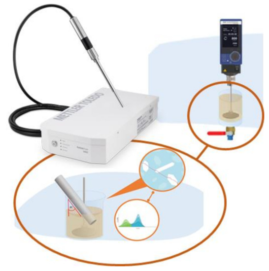 The Focused Beam Reflectance Measurement (FBRM) system (Particle Track E25, Mettler Toledo, OH, USA) was used to measure the aggregate size evolution (Figure 4). The system consists of a processing unit with a 19 mm diameter probe tip placed vertically in the flocculation vessel 10 mm above the stirrer and 20 mm off the rotation axis. The technology is based on light backscattering using a revolving laser beam projected into the sample suspension through a sapphire window (14 mm in diameter) at the end of the probe. The beam rotates at 2 m/s, and thus the particles still appear despite the stirring of the sample suspension. The light backscatter time of each particle is multiplied by the scanning speed resulting in a chord length that correlates with the true particle size. A chord length distribution (CLD) of the particles is obtained in real-time in a specified measurement time span. The raw chord length distributions (unweighted) were considered not to lose information on the smallest aggregates, and the squared-weighted chord distributions to not lose information on the largest aggregates. The average size of the aggregates was obtained considering the squared-weighted chord distribution acquired every 2 s.