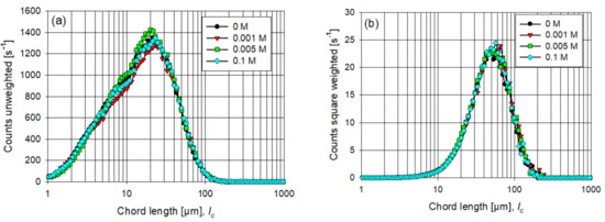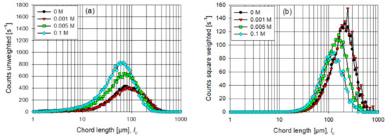 The unweighted chord length distribution (Figure 7a) shows that the peak is close to 100 microns in distilled water, while in the squared-weighted distribution (Figure 7b), the peak is close to 110 microns. A small salt (0.001 M NaCl) addition caused both distribution curves to shift to slightly larger floc sizes. While the height of the unweighted distribution peak decreases (from 400 s−1 to 300 s−1), the square-weighted peak increases (from 150 s−1 to 160 s−1), indicating that as the number of small aggregates decreases, the number of large massive aggregates increases. These results are expected, because cations promote the flocculant chains’ adsorption through cationic bridge bonds with the mineral surface, thus enhancing flocculation [26]. On the other hand, the results show that an increase in salinity (>0.001 M NaCl) severely inhibits flocculation. Figure 7a indicates that the number of small particles increases, and their size decreases (<100 µm) with salt concentration. Simultaneously, Figure 7b shows that the number of large aggregates decreases. In 0.1 M NaCl, the unweighted distribution peak is located at 70 µm with a height of 800 s−1, while the squared-weighted distribution peak is at 120 µm with 90 s−1.