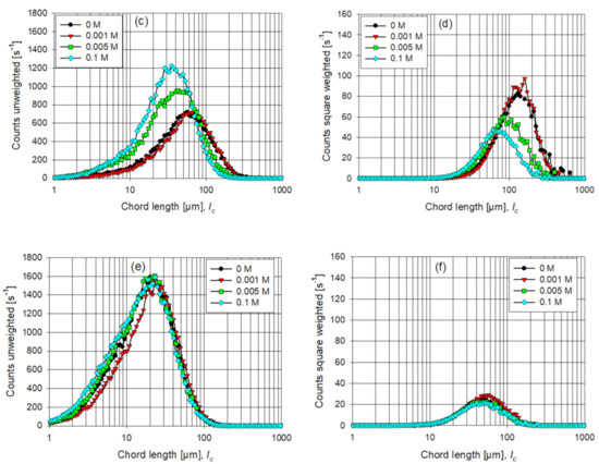 Unweighted (left column) and squared-weighted (right column) kaolin cord length distributions in saline solutions (NaCl). The distributions were measured 20 s after increasing the initial agitation of the flocculation process. The first row, (a,b), corresponds to the base case at G = 273 s−1, the second row, (c,d), at G = 502 s−1 (G = 229 s−1 increment), and the third row, (e,f), at G = 1789 s−1 (G = 1516 s−1 increment).