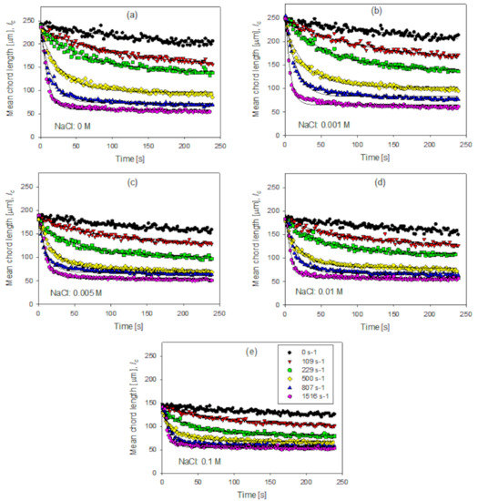 An interesting study was carried out by Blanco et al. [21], who analyzed the evolution of the mean chord size using FBRM after applying a sharp increase in the shear rate. The researchers determined the resistance of the flocs to shear forces by fitting the evolution of the mean chord size to a pseudo-first-order model Equation (3).