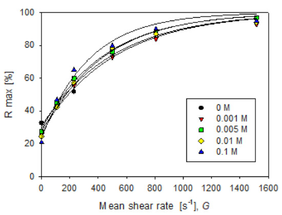 It is possible to estimate the maximum aggregate rupture at an infinite time for each increment in shear rate (ΔG); for this, Equation (9) is used: