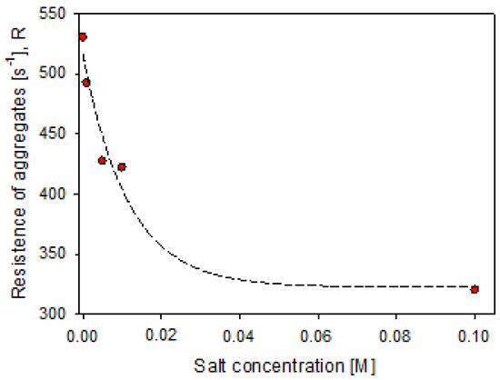 Salinity alters the flocculation process by modifying the interaction forces between the particles. Figure 11 shows the effect of NaCl concentration on the resistance of kaolin flocs in terms of the aggregate resistance obtained from Equation (10). The result is interesting, considering that a monotonic relationship is obtained between the salinity of the system and the strength acquired by the particle networks. The maximum resistance is achieved when the aggregates are formed in a salt-free environment, with = 530 s−1. This value gradually decreases, in the form of exponential decay, with increasing salt concentration, reaching s−1 at a concentration of 0.1 M. This reduction in floc resistance can be explained based on structural changes prompted by salinity.