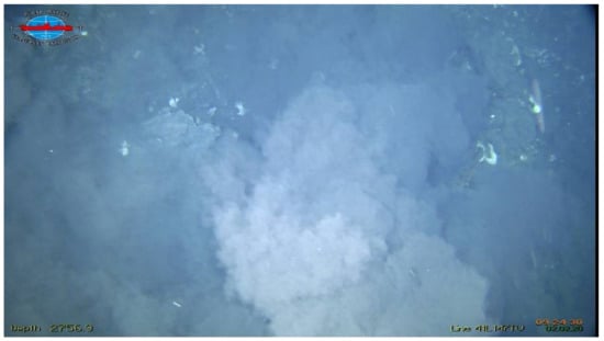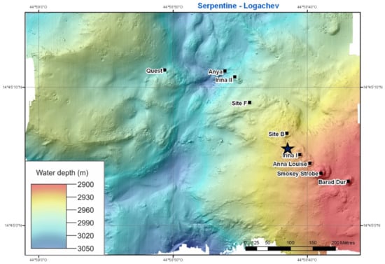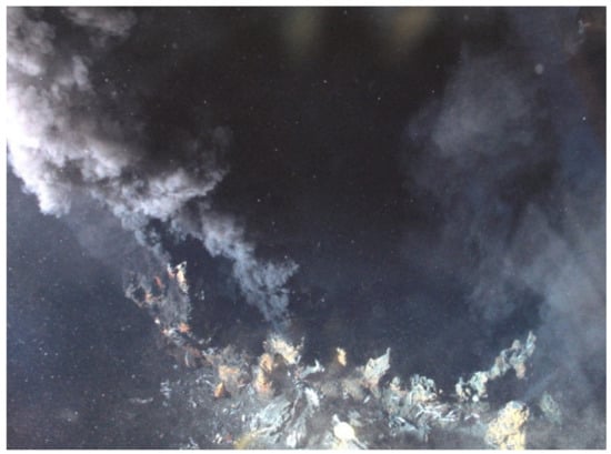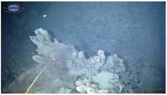 Earlier, detailed measurements as well as photo and video surveillance in the SERPENTINE expedition on the R/V Pourquoi pas? [8] from the remotely controlled multifunctional apparatus ROV Victor 6000 (Ifremer, Plouzané, France) showed that the Irina 1 source is a combination of a “smoking” crater and short pipes of black smokers that are 0.2–1.0 m high surrounding the crater (Figure 2). The temperature of the hydrothermal solution measured in situ in the vents of smokers was 190–350 °C.