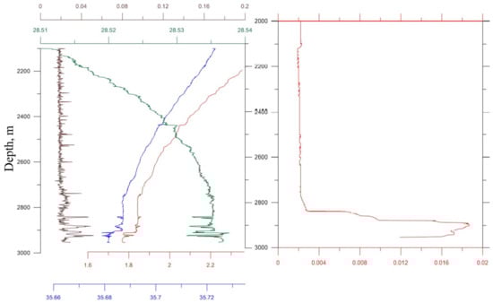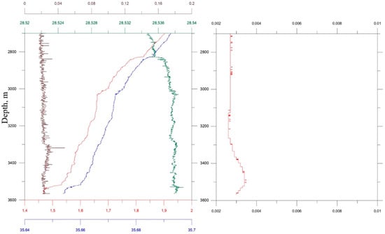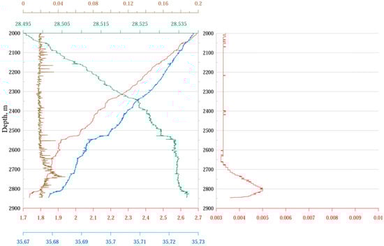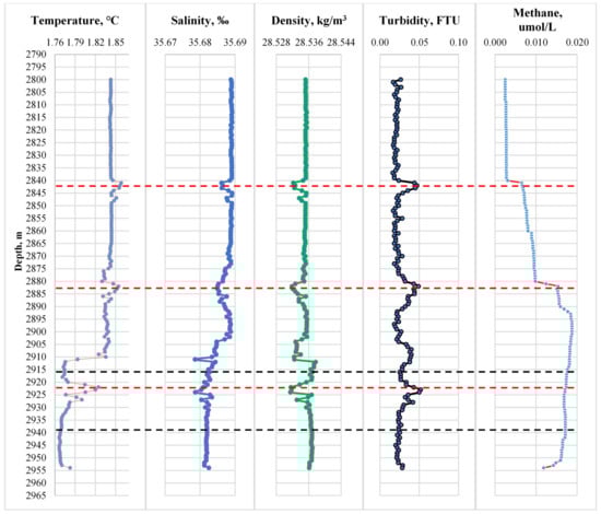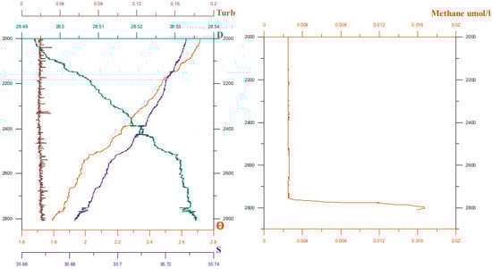 Increased methane concentrations were observed in the bottom strata at the depth interval of 2840–2930 m (Figure 3). There are sharp fluctuations in turbidity, temperature, salinity, and density on the CTD plots of sounding at this depth interval. This indicates the confinement of the methane anomaly to the ascending turbulent plume, with a distinctly uneven, pulsating character of the discharging fluid (due to phase differentiation) [51,52,53,54].