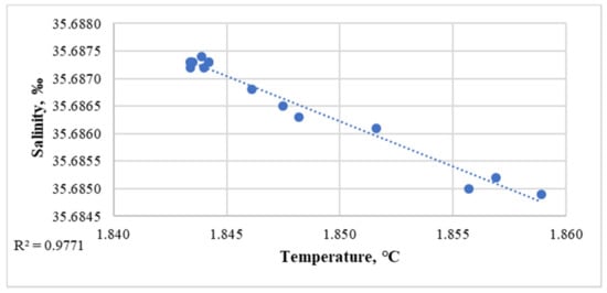 Salinity/temperature regression line for the bottom water layer at a depth of 2835–2850 m. Source: Irina 1, Logachev field.