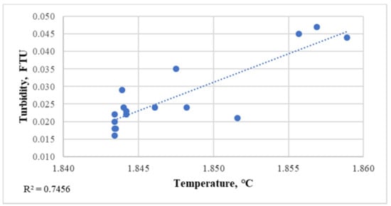 Turbidity/temperature regression line for the bottom water layer at a depth of 2835–2850 m. Source: Irina 1, Logachev field.