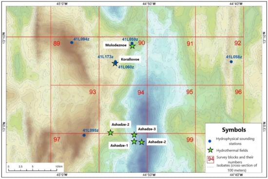 During cruise 41 of the R/V Professor Logachev, two new hydrothermal fields were discovered and studied—the Koralovoe and Molodezhnoe. The hydrothermal fields are of a marginal (flank) type, located on the gentle western side of the rift valley (Figure 7).