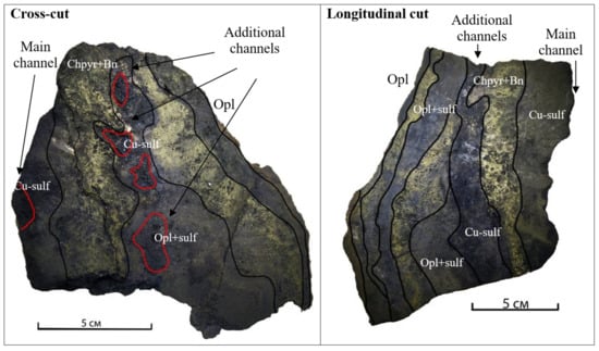 A fragment of a chimney wall. On the left—a cross-cut, on the right—a longitudinal cut. Opl: opal; Chpyr: chalcopyrite; Bn: bornite; Cu-sulf: non-stoichiometric copper sulfides. Field Molodezhnoye.