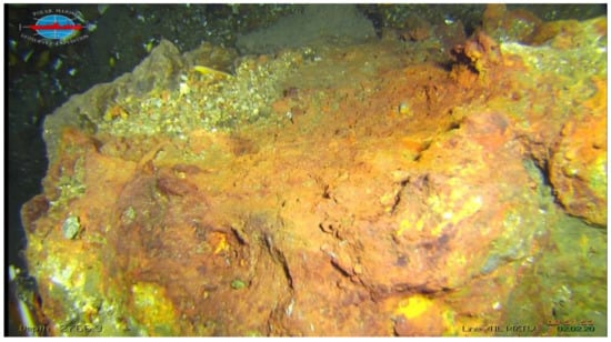 At the Korallovoe vent field, video surveillance revealed sulfide chimneys, black hydrothermal smoke, a hydrothermal fauna of crabs and mussels (Figure 11), and hydroxide–ferruginous crusts. Most of the collected samples of hydrothermal formations are vein-disseminated ores. Pipe fragments and hydrothermal crusts are rare.