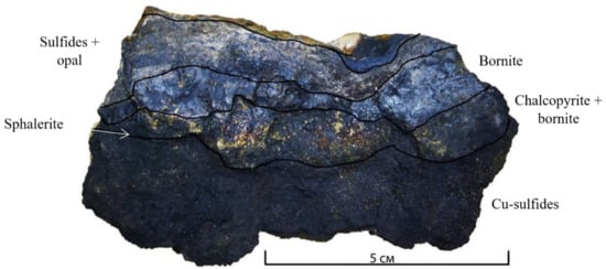 The chimneys of the Koralovoye vent field differ in their zonal structure (Figure 13). The inner zone (from 3 mm to 5 cm) is composed of loose copper sulfides, sometimes impregnated with tiny crystals of chalcopyrite and sphalerite. The chalcopyrite-bornite zone is usually about 0.5–1 cm. In places, there is a thin black coating on chalcopyrite crystals (probably tenorite). One of the most massive zones of the structure is bornite with a blue tempering. The width of the bornite zone is usually 1–3 cm. In this zone, nests of fine-medium-grained chalcopyrite and opal smears are often observed.
