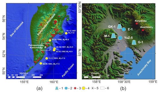 Kamchatka Peninsula (Figure 1a) is located at junction of Pacific Ocean Plate with the Eurasia and North America continental plates. Strong earthquakes often occur here, accompanied by destructive ground movements and tsunamis.
