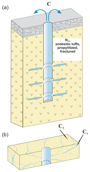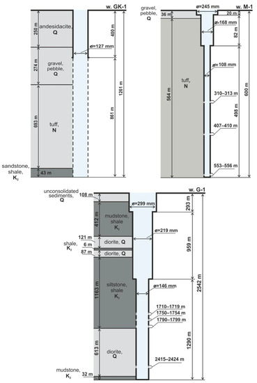 Well M-1 with a depth of 600 m opens fractured-vein groundwater in Miocene tuffs in intervals 310–313, 407–410 and 553–556 m (Figure 2). Water-bearing rocks are characterized by ubiquitous propylitization and fracturing.