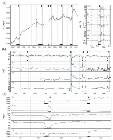 Anomalous effects (bold horizontal lines) in time series of groundwater ion and gas content variations from wells: (a) GK-1, (b) M-1, (c) G-1. Vertical lines show 1987–1997 earthquakes (Figure 1a), earthquake numbers correspond to Table 2. Red dashed rectangle highlights changes in Cl− concentration in water from well GK-1 and blue dashed rectangle highlights changes in HCO3−, SO42−, Ca2+ and Na+ concentrations in water from well M-1 due to earthquake on 2 March 1992 (Table 2).