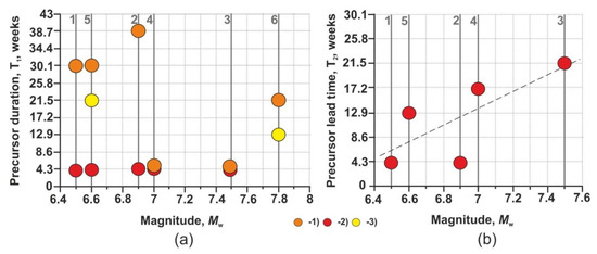 (a) Distribution of the precursor duration (T1) in observation wells: (1) GK-1, (2) M-1, (3) G-1, depending on magnitude Mw of earthquakes No. 1–6 in Table 2; earthquakes are shown with gray vertical lines. (b) Distribution of the lead time (T2) of preseismic anomalies in well M-1 (Figure 3b), depending on magnitude Mw of earthquakes No. 1–5 (linear correlation coefficient is 0.74).