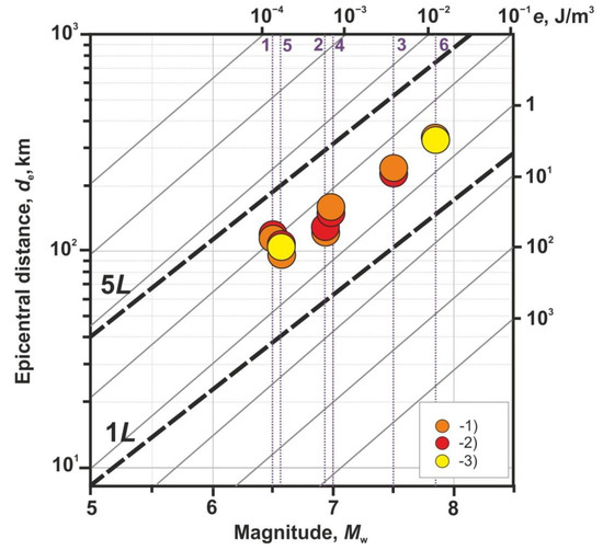 Figure 5 from paper [2] demonstrates the relationship between preseismic hydrogeochemical anomalies and magnitude and epicentral distance to wells of subsequent earthquakes. Distribution of specific density of seismic energy e [9,11,22,23] depending on earthquake parameters also shows in Figure 5. The e value is considered as a parameter of earthquake impact in area of a well with preseismic hydrogeochemical anomaly.