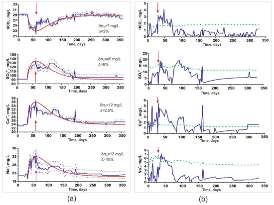 (a) Changes in HCO3−, SO42−, Ca2+, Na+ concentrations in water from well M-1 due to earthquake on 2 March 1992 (earthquake moment—red arrow) and results of calculations according to (3) at t0 = 20 days and τ0 = 50 days. Blue lines—observational data; blue dotted lines—interval of concentration taking into account the error of determination Δi according to (1); red lines—calculated concentrations; δσ0—amplitude of precursor anomaly. (b) Changes in the absolute values of residuals between the measured concentrations and calculated values (blue lines) in comparison with the double error Δi in determining each concentration value (green dashed line).