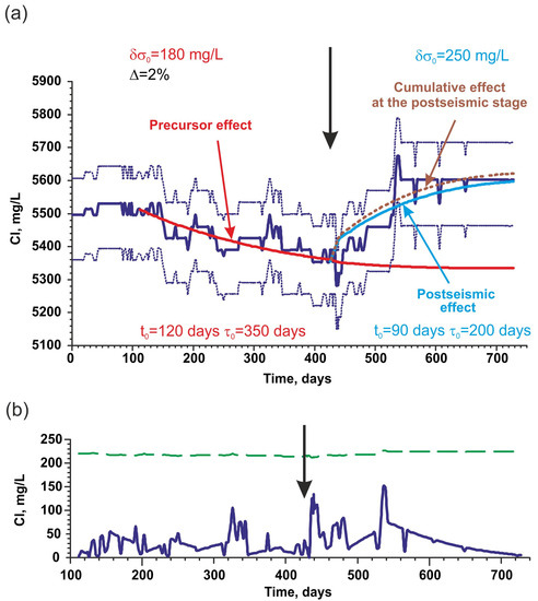 At stage of earthquake preparation, the anomaly manifested in decrease Cl− concentration by 180 mg/L (Figure 3a; red rectangle) or by 3% in relation to background concentration. At postseismic stage, the Cl− concentration increased (Figure 3a).