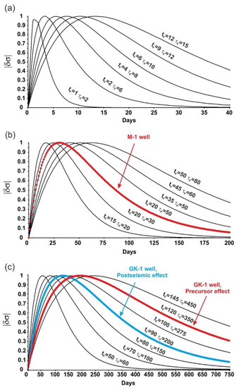 Using observational data and Formula (3), we have built models of hydrogeochemical precursors and postseismic anomalies for wells GK-1 (Figure 3a and Figure 7) and M-1 (Figure 3b and Figure 6) in case of the earthquake on 2 March 1992. It was found that the parameters t0 and τ0 can differ significantly for two considered wells, even with the same earthquake.