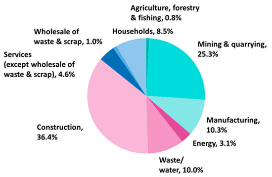Extractive and raw materials processing industries are strongly related to the generation of large volumes of solid wastes and residues. In 2016, mining and quarrying activities in the EU-28 were accountable for 25 billion tones, almost 25% of the total waste generated [1] (Figure 1), and these steadily increased in the following years.
