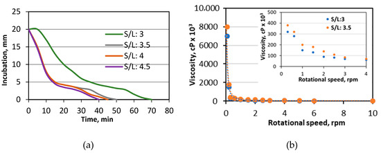 The aim of this study is to define the optimum rheological properties of the geopolymer pastes, which will be mixed up with Al powder (blowing agent) in the next step, to produce porous materials. This means that the rheology of the paste is a crucial factor controlling the quantity of gas (produced by Al powder) that will be entrapped in the geopolymer matrix, leading to successful foaming of the prepared slurry. As a result, setting-time tests and viscosity measurements (Figure 4), carried out on geopolymer pastes of different solid-to-liquid ratios, enabling the appropriate rheological conditions to be defined. The effect of the solid-to-liquid (S/L) ratio on the geopolymer pastes setting time was investigated in the range of 3 to 4.5 g/mL. Lower S/L values resulted in watery pastes, with no potential to keep an adequate gas amount during foaming. Higher S/L values led to slurries with extremely high viscosities, as indicated by the intensive mixing conditions required during the mechanical stirring of the paste. Extremely high viscous pastes are not desirable for blowing agent addition, prohibiting the smooth gas release inside the matrix and resulting in non-homogeneous porous materials. The KOH concentration in the activating phase, and the curing temperature, were both kept constant at 8 M and 70 °C, respectively. The results are shown in Figure 4a, where the setting time is plotted at different S/L ratios.