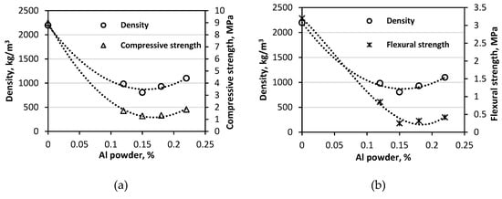Figure 5 depicts the apparent density, and (a) compressive strength and (b) flexural strength of the foam boards as a function of the content of the foaming agent (Al powder) in the paste.