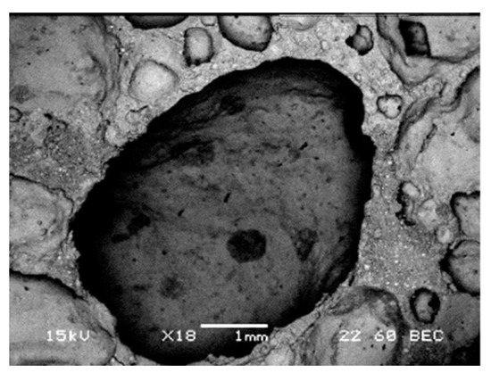 Figure 6. Scanning electron microscopy images of GeoFoam at magnification ×18 and scale 1 mm (S/L: 3.5 g/mL, [KOH]: 8 M, Al powder addition: 15 wt.%, curing: 48 h at 70 °C).