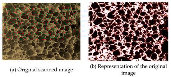 Figure 7. Digital processing of the scanned geopolymer foam plates. (a) Original scanned image of the saw-cut flat surface of a sample; (b) with black representing the voids, white the flat material matrix and red the extracted void boundaries.