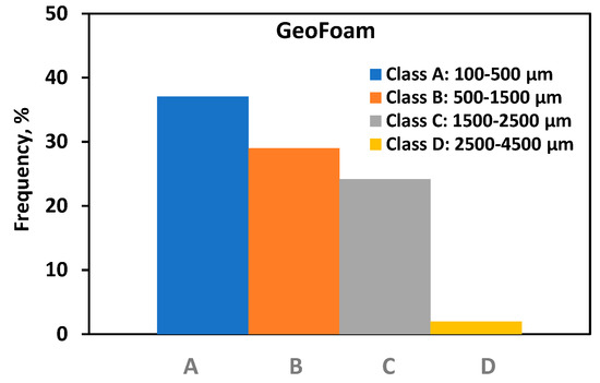Even though GeoFoam consists of big pores, as indicated by the microstructure study and digital processing techniques (Figure 6; Figure 7, respectively), the presence of small-sized cells (class A) is intensive, while medium pore sizes (class B and C) are also detected with high frequency. However, a smaller number of bubbles with larger volumes is produced. This appears to be a result of the merging of many smaller bubbles into less larger ones, which was easily demonstrated by the SEM (Figure 6) and scanned images (Figure 7) of the final board. These larger perforated voids clearly form from more circular voids, as can also be detected by the red threshold voids consisting of smaller circular shapes.