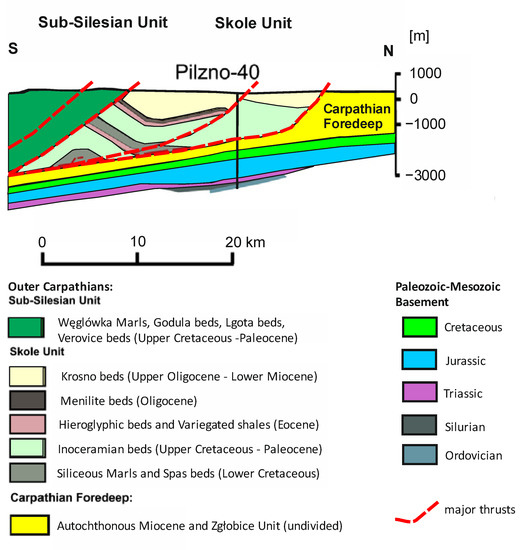 - Ślączka, A.; Kruglov, S.; Golonka, J.; Oszczypko, N.; Popadyuk, I. Geology and hydrocarbon resources of the Outer Carpathians, Poland, Slovakia, and Ukraine: General Geology. In The Carpathians and Their Foreland: Geology and Hydrocarbon Resources; Golonka, J., Picha, F.S., Eds.; AAPG Memoir: Washington, DC, USA, 2006; Volume 84, pp. 221–258. [Google Scholar]