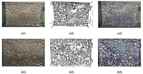 The pixel areas of the closed contours are counted, and the cumulative/frequency area distribution is calculated. The area screen filters are set to be 2000, 4000, 6000, 8000, 10,000, and larger than 10,000 pixels. Due to the rock sample size (0–22.4 mm), it is not feasible to label all the rocks in an image manually, especially with fine regions. Hence, the comparison between the manual label image and the auto-processed images is not considered an evaluation criterion but serves as a demonstration. Instead, the mass is estimated from the pixel area distributions. The conversion from the pixel area to mass is conducted with the following equation:
