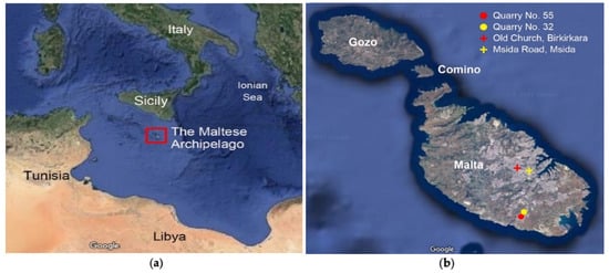 The LGL is one of the soft limestones outcropping in the Mediterranean Basin. Often referred to as “Malta stone”, it is the main industrial mineral terrestrial resource of the Maltese Islands. It is easy to quarry—it is “soft, and easy to cut into any shape” [5] (p. 46), and outcrops over two thirds of mainland Malta [6], the main island of the Maltese Archipelago. With a superficial area of approximately 316 km2, this archipelago is located circa 93 km south of Sicily and 288 km north of Libya, and comprises several islands, the inhabited ones being Malta, Gozo and Comino.