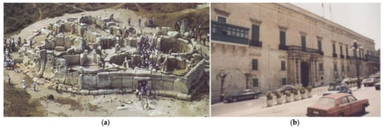 Dated photo of: (a) Ħaġar Qim Neolithic Temples, Qrendi, one of the UNESCO World Heritage sites in Malta (Ħagar Qim by peuplier is licensed under CC BY 2.0) [30]; (b) the Grandmaster’s Palace, Valletta.