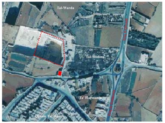 Aerial imagery, dated 1998, of Tal-Warda quarry (outlined in red) and the Chapel of St Catherine (in red) [83]; for the location of site with respect to Malta, see Figure 1b.