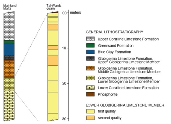 LGL has been quarried since the Neolithic period (3600–2500 BC), and is still the principal source of limestone for buildings on the Maltese Islands—whether for the construction of contemporary architectural and infrastructural works or for the restoration of built heritage. It was utilized by builders flourishing during one of the oldest Neolithic civilizations of the Mediterranean Basin [7,8,9,10,11]. Archeological structures dating from this period illustrate that those who built them differentiated between the softer, less durable LGL and the harder, denser, stronger and more durable varieties of Coralline Limestone (CL) used for external walls, which were uncarved. In contemporary minerals planning practice in Malta, LGL and CL are referred to softstone and hardstone, respectively.
