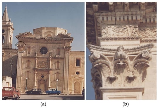 To comprehend what constitutes first-quality LGL, samples were taken from (i) the seventeenth-century Baroque Church of Santa Maria at Birkirkara (UTM coordinates: 451543E, 3972435N, Figure 1b), the subject of a recent publication [85] (Figure 6a) and (ii) Piccolo Fewda quarry, officially known as Softstone Quarry No. 32 (Figure 1b), in Mqabba (UTM coordinates: 447091E, 3584992N) which, at the time, was providing LGL for the restoration of the church [79,86]. Although in partial ruin until restoration works commenced in 1969, the original carvings on the main elevation of the church have weathered well, and the acanthus capitals are in optimal condition (Figure 6b). Thus, the limestone in which the church was erected arguably represents the best quality lithotype available at that time, which, according to tradition, was quarried from the limits of “Tal Balal” (UTM coordinates: 452223E, 3967432N). Old quarries in this locality were reclaimed for agrarian use, so the precise location of the site from which the original dimension stones were extracted is difficult to trace. Samples from the Piccolo Fewda quarry were collected with the assistance of the quarry owner Salvatore Bondin, a third-generation quarryman with over six decades of quarrying experience and a former President of the Softstone Quarries Association (of Malta).